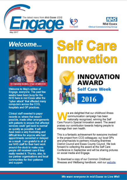 Engage – May 2017 Posted on 1st May 201728th Jan 2020 by swfhealthsocial The latest news from Mid Essex CCG: Share this article: Click to share on Facebook (Opens in new window) Facebook Click to share on X (Opens in new window) X Click to share on WhatsApp (Opens in new window) WhatsApp More Click to print (Opens in new window) Print Click to email a link to a friend (Opens in new window) Email Click to share on LinkedIn (Opens in new window) LinkedIn Related