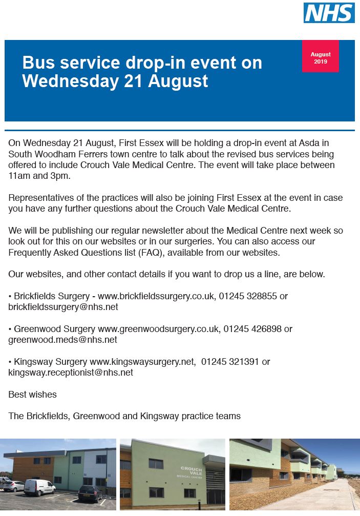 The three GP practices in South Woodham Ferrers are inviting all residents to a drop-in event at ASDA in the town centre between 11am and 3pm this Wednesday, 21 August, to find out more about the revised First Essex bus services to the new Crouch Vale Medical Centre.