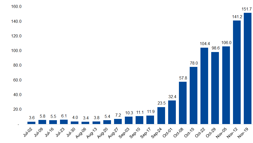 This chart shows the number of new COVID-19 cases recorded in the previous seven days per 100,000. For example, 15 October relates to 9 October to 15 October.