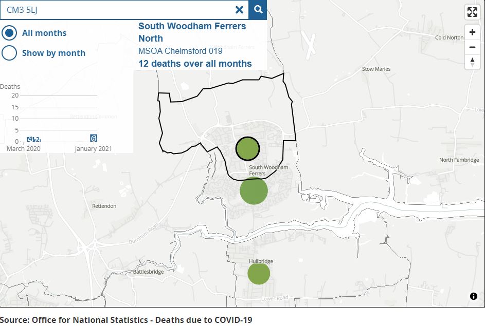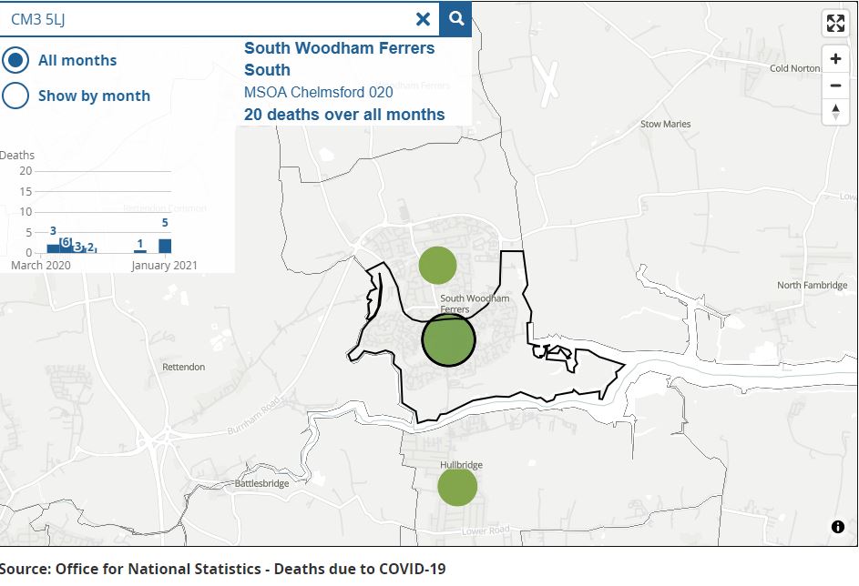 An interactive map released by the ONS (Office for National Statistics) has shown that 32 people have sadly died from Covid in South Woodham Ferrers.