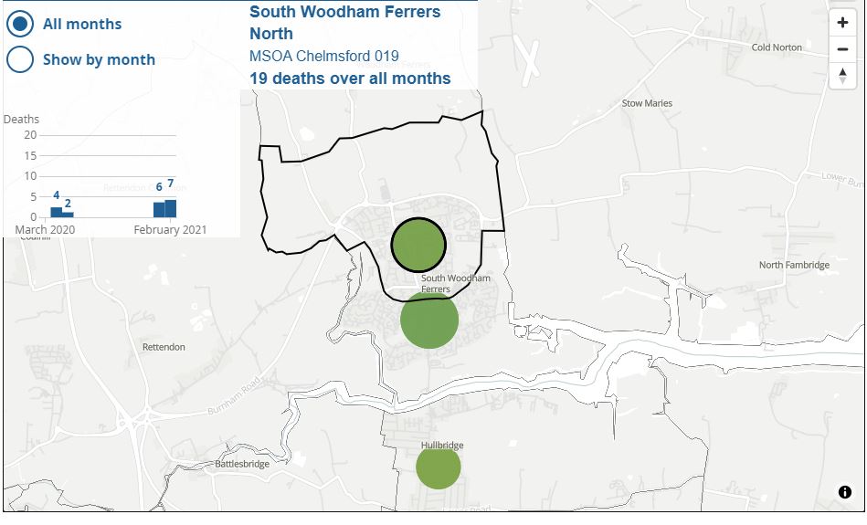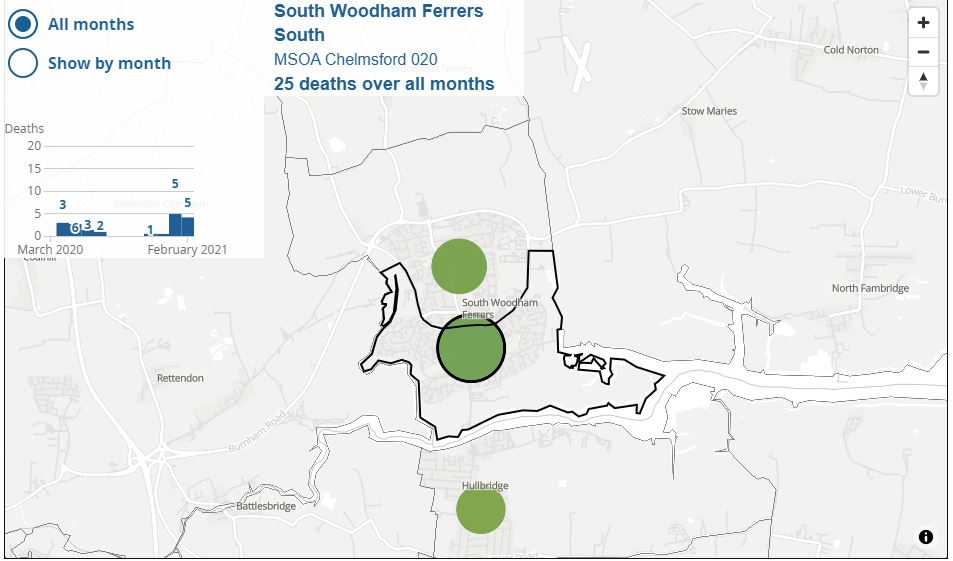 An interactive map released by the ONS (Office for National Statistics) has shown that 44 people have sadly died from Covid in South Woodham Ferrers.