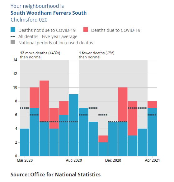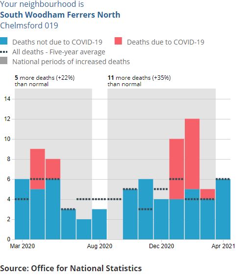 The excess deaths for SWF between March 2020 and April 2021 are 27 more deaths than normal which is an increase of 24.5%.
