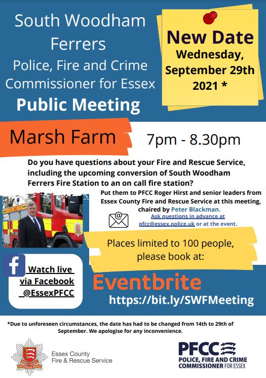 The PFCC Public meeting in South Woodham will now be held on Wednesday the 29th of September, due to unforeseen circumstances affecting availability. The event on the 29th will still be held at Marsh Farm between 7:00 and 8:30pm and be chaired by an independent facilitator Peter Blackman.