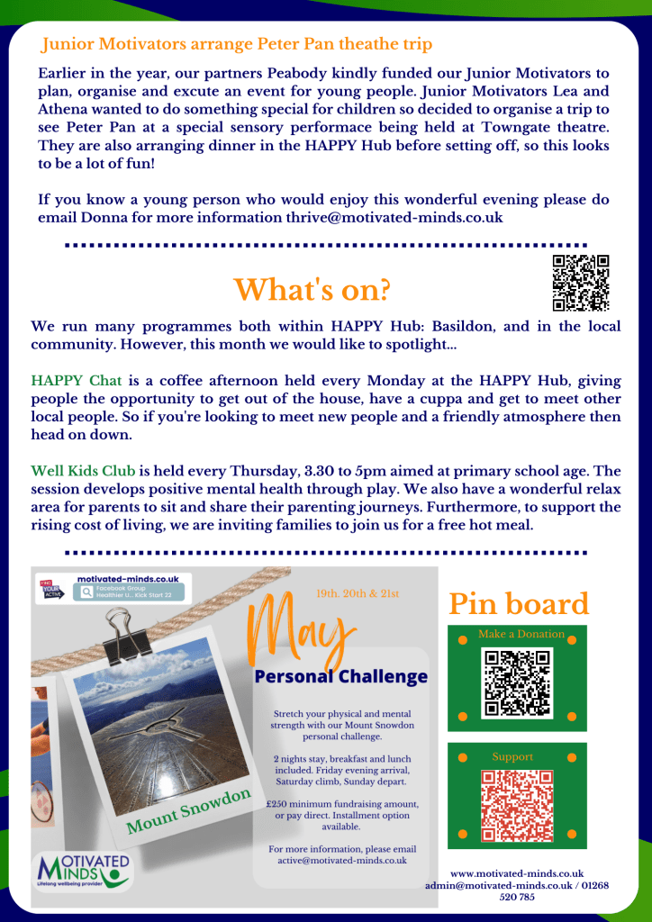 | FAQ… What do Motivated Minds do? As a lifelong mental health and wellbeing provider we deliver a range of solutions in the community, in schools, and with businesses. Do you just work in Basildon? No, we can work anywhere. Where’s the HAPPY Hub? Our one-stop-wellness-shop is in Eastgate Shopping Centre, Basildon, SS14 1AE (next to Asda) When is the HAPPY Hub open? Monday: 11.00 am – 5:00 pm (closed bank holidays) Tuesday: 10.00 am- 5.30 pm Wednesday to Saturday: 10:00 am – 5:00 pm Sunday: CLOSED How can I find out more about Motivated Minds and the HAPPY Hub, and see updates? Why not join our Facebook and Instagram or Twitter pages or you can look on our website. How can I support Motivated Minds? We always appreciate volunteers to help us in varies roles or at events. Or if you are taking part in a sponsored event – think of our charity for your cause. Give us a call for any queries. |