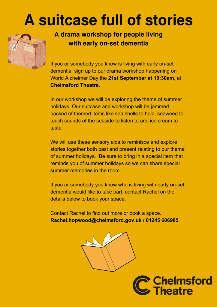 We are looking to invite 10 local people living with early-on set dementia alongside up to two carers or family members for each person to participate in the session. We are delighted to be able to offer this project free of charge to participants and their accompanying carer/ family member. Chelmsford Theatre wants to provide the opportunity for those living with dementia in our local community a space to socialise, connect, tell stories and be together on the significant date with it being World Alzheimer’s day.