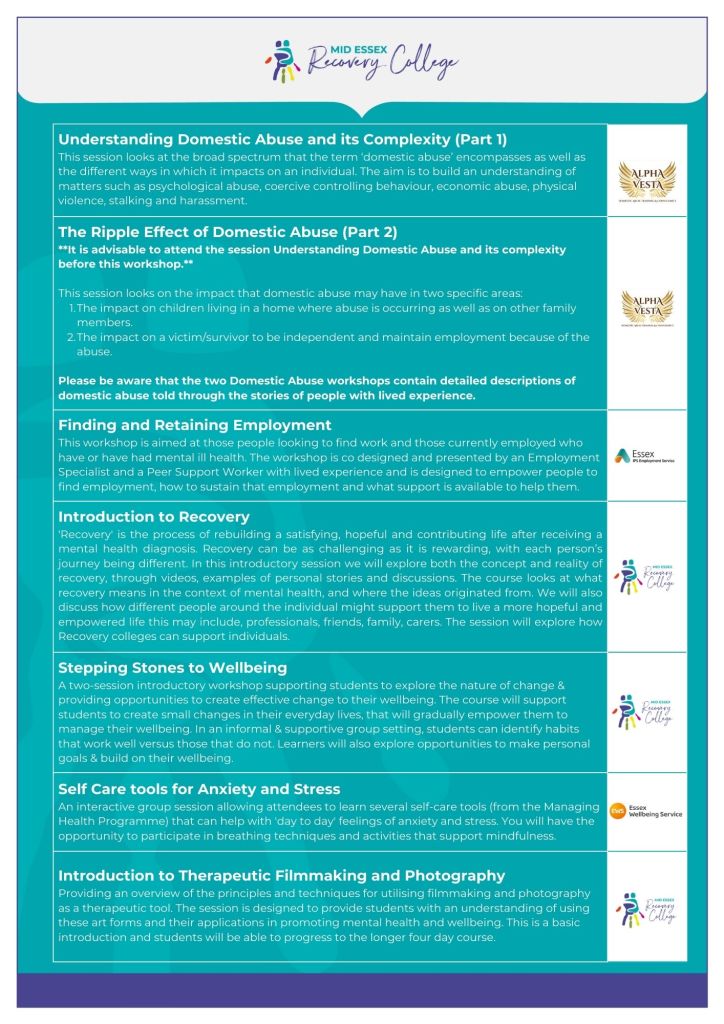 Courses are available to anyone within the Mid Essex area who have experienced or are experiencing mental health challenges themselves, who are supporting another person with their mental health challenges or who just want to learn more about the topics covered. We have workshops covering a range of subjects from Wellbeing, Anxiety and Employment to Filmmaking and Domestic Abuse.