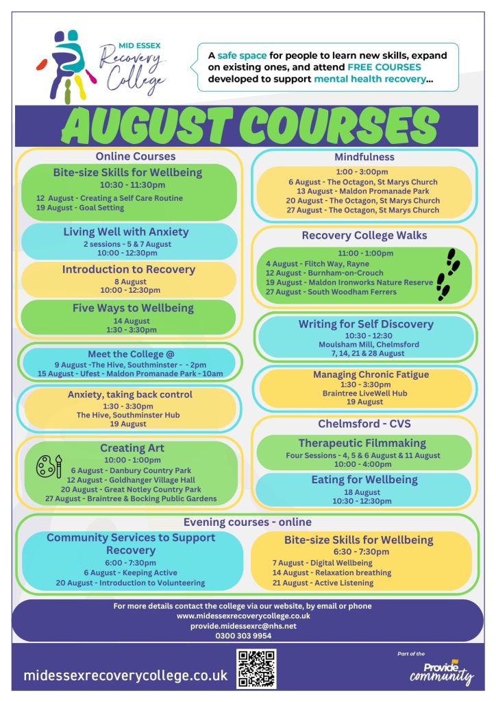 - Anxiety, taking back control – will be running in The Hive in Southminster this month and uses a CHIME approach to look at Anxiety. If you have completed this course in the past you may be interested in joining the more in-depth online Living Well with Anxiety sessions on the 5 and 7th of August